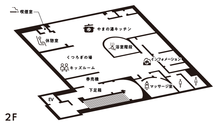 キッズコーナーは、お子様を楽しく遊ばせながら囲むイメージです。少し離れた場所から、お子様を親御様が優しく見守れる距離感を重要視しました。親御様も入浴後の楽しい時間を過ごしながら、お子様もまた楽しめる。そういう意味があります。「やまの湯はファミリーのお客様を大歓迎しています」との象徴的なスペースでもあるのです。
